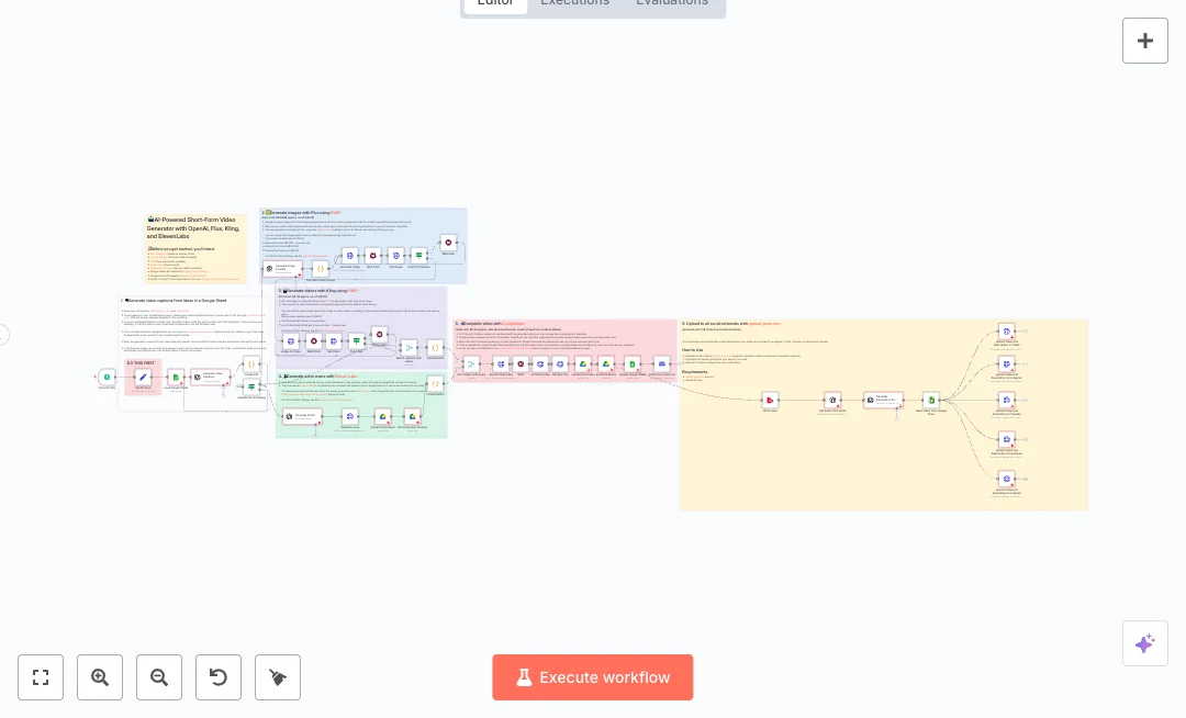Here is how it works. A daily trigger reads your sheet and asks OpenAI to write five captions. The flow validates the list and tracks token use for cost control. Images are created with Flux through PiAPI, then each image becomes a video clip with Kling via PiAPI. ElevenLabs produces a voiceover, which is stored on Google Drive. Captions, clips, and audio are merged and sent to a Creatomate template for rendering. The final video is saved to Google Drive, sharing is enabled, the sheet is updated with links and costs, and a Discord message confirms completion. An optional branch extracts audio from the final video, asks OpenAI to write platform text, and uploads to TikTok, Instagram, YouTube, Facebook, and LinkedIn using upload-post.com.