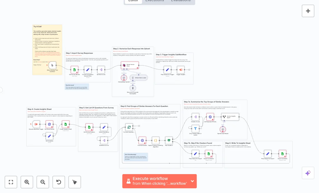 The workflow loads survey rows from Google Sheets, converts each row into question and answer pairs, and adds helpful tags like question, participant, and survey name. It creates embeddings with OpenAI and stores them in Qdrant so answers can be grouped by meaning, not just keywords. For each survey question, it fetches the related answers from Qdrant, runs K means clustering, filters out small groups, and pulls the full text for each cluster. An OpenAI chat model then writes a short summary and a sentiment score for every top group. Results are written to a new Insights sheet in the same spreadsheet.