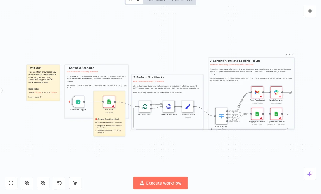 A Schedule Trigger starts the run every six hours. The Google Sheets node pulls the list of sites and their last known status. Split In Batches loops through each site, and an HTTP Request tests the URL and reads the response headers. A Set node builds flags to spot status changes and captures the response date. The Switch node routes results: send an email first, then a Slack message if a site is down or the status changed. Every check is logged to a sheet named after the site, and the main dashboard row is updated.