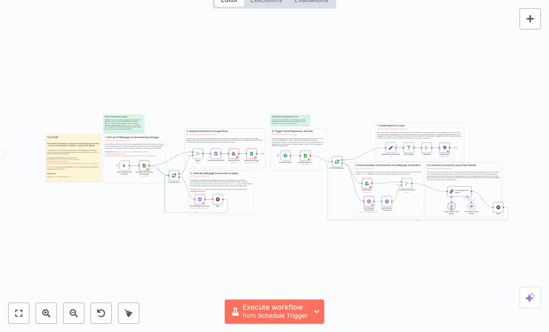A schedule pulls URLs from Google Sheets. For each page, the workflow downloads the base image from Google Drive, generates a fresh screenshot with Apify, and compares both images using a Google Gemini vision model with a structured JSON result. Results are merged back with the row, non changes are filtered out, and all detected changes are aggregated into one report. The Linear node creates a new issue with a readable summary. Manual mode helps build or refresh base images by finding rows with missing files, capturing screenshots, uploading to Drive, and writing the Drive file ID back to the sheet. Wait nodes handle the screenshot job timing.