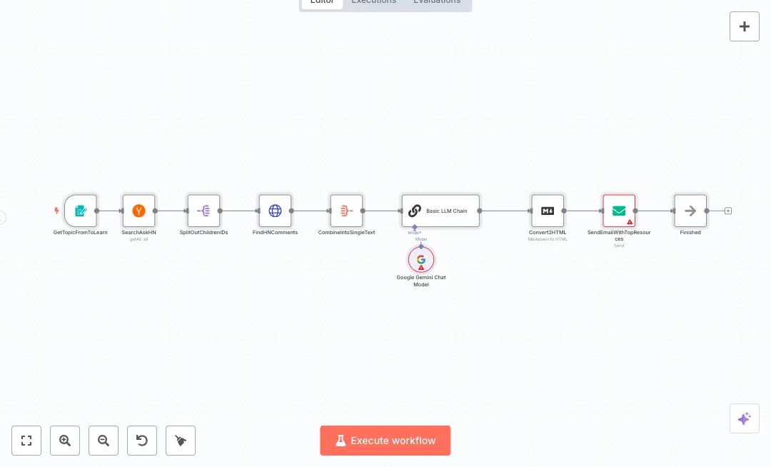 Here is how it runs. A form collects the topic and the user’s email. The flow searches Ask HN posts that match the topic, splits out comment IDs, then fetches each comment through the Hacker News API. All comment text is merged into one block. Google Gemini reviews that content and writes a short list of the best resources in markdown. The markdown converts to HTML, and Gmail SMTP sends an email with the selected picks and the number of comments reviewed. You get curated, community backed learning resources without manual research.