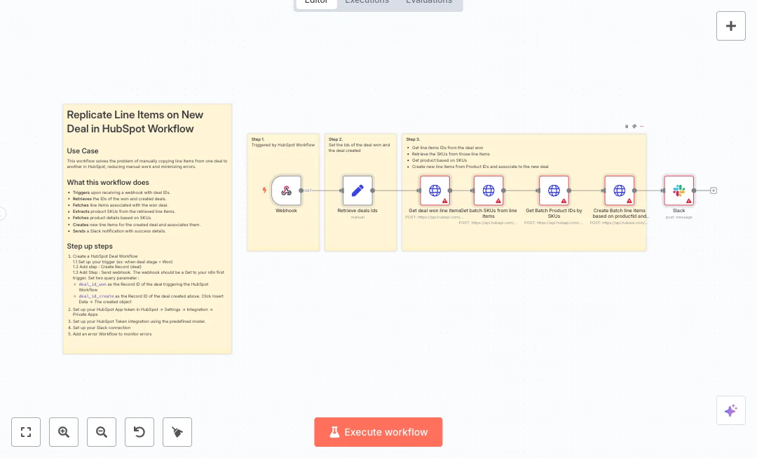 It starts with a webhook call from your CRM workflow that passes two IDs, the won deal and the new deal. n8n reads those values, finds the line items linked to the won deal, and pulls their SKUs in a single batch. Using those SKUs, it fetches the matching products and creates the same items on the new deal with one batch create call. A Slack message then posts links to the workflow and the deal so your team can verify in seconds. Batch requests keep API calls low and speed up processing even when many items are present.