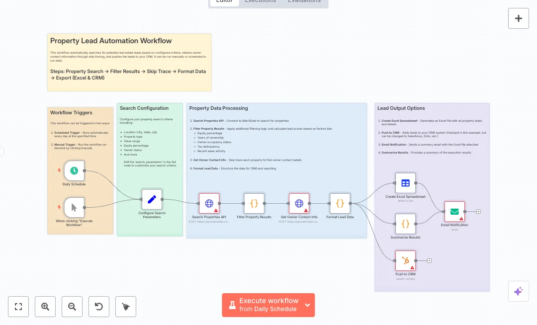 Find and capture real estate leads with a daily or on demand run. It searches properties that match your rules, finds owner contact details, and sends the leads to your CRM with a report. Ideal for acquisitions teams, agents, and investors who want steady, qualified leads without manual research.