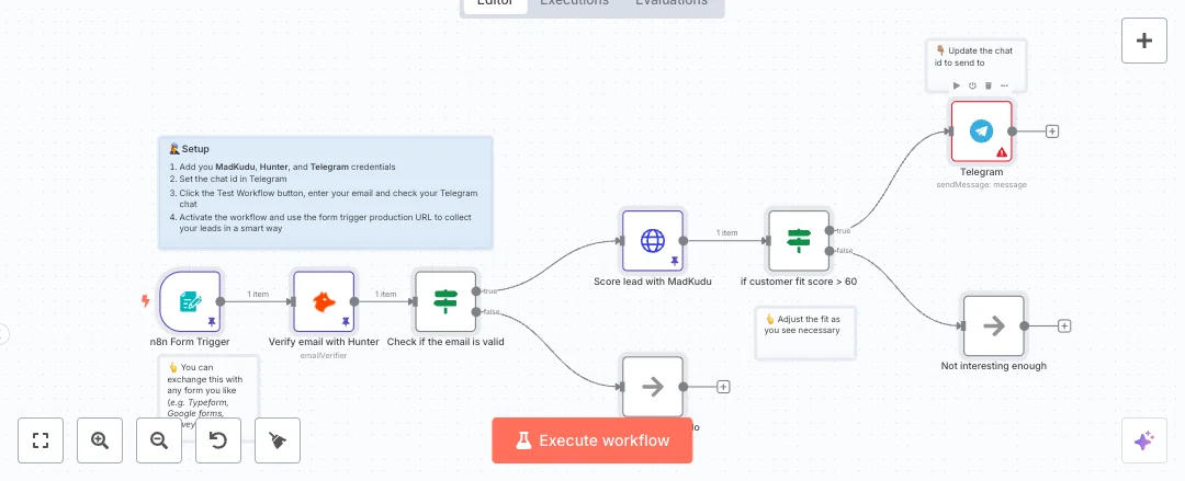 Turn form signups into qualified sales alerts. The setup checks if an email is real, scores the contact for customer fit, and pushes hot leads to Telegram in near real time. It helps sales teams focus on people who are more likely to buy.