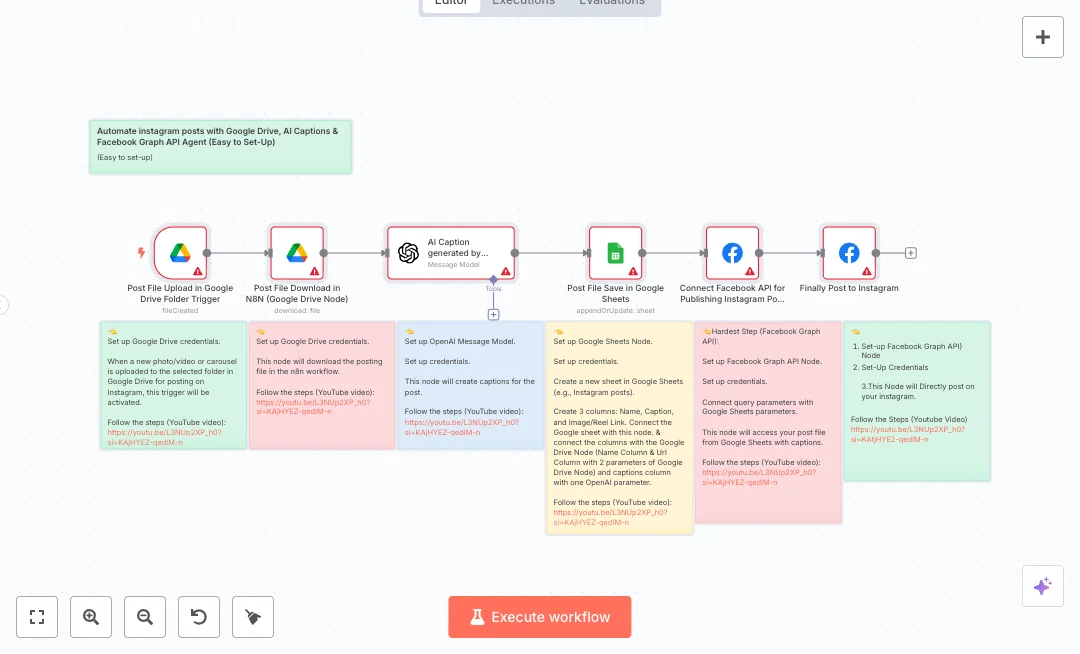 You need Google Drive, Google Sheets, OpenAI, and a Facebook Graph connection linked to an Instagram Business account. Expect to cut posting time from about 30 minutes to around 3 minutes per item and keep every post documented. Useful for teams that collect assets in Drive and want a repeatable posting system with clear records and less manual copy paste.