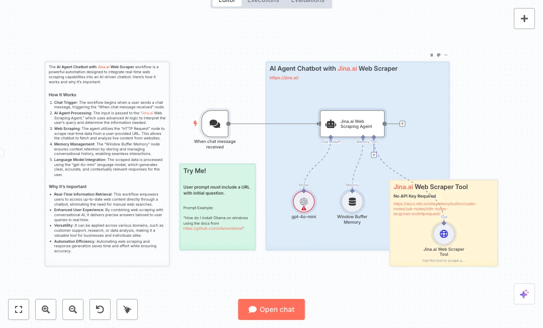 A chat message starts the flow. The agent uses OpenAI gpt 4o mini with a short memory window to keep context across turns. It calls a web scraping tool that fetches readable page text from the URL inside the message using r.jina.ai. The agent then analyzes the content and replies in simple language. No key is needed for the scraper, which makes testing easy. This design brings real time page data into the chat, so answers reflect the latest content on the site.