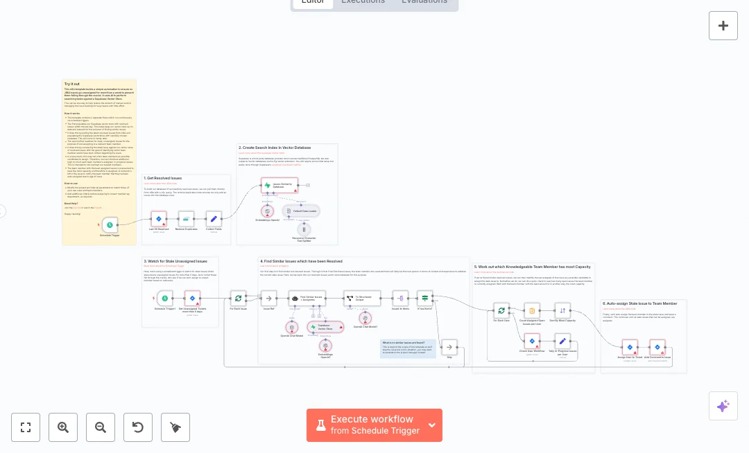 Two scheduled runs power the flow. One job pulls recently resolved Jira issues, removes duplicates, formats the text, creates embeddings with OpenAI, and stores them in a Supabase vector database. The other job checks Jira for unassigned To Do issues older than five days. For each stale issue, an AI agent searches the vector store for similar resolved tickets and notes who fixed them. The flow turns those people into candidates, checks each person’s current In Progress count via Jira JQL, picks the least busy teammate, assigns the issue, and leaves a comment. If no good match is found, it skips.