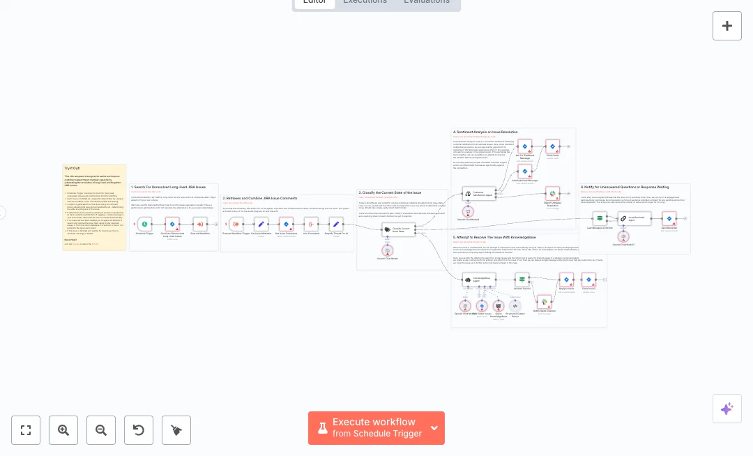 On a daily schedule, it pulls a list of long lived issues and runs each one in parallel for speed. It gathers every comment, builds a clean thread, and sends the summary to an AI model that classifies the ticket state. When a fix is already reached, it posts a closing note, checks sentiment, and either asks for a review or alerts a Slack channel if the customer is unhappy. If no teammate has replied, an AI agent searches similar Jira cases and Notion pages to draft a clear answer, then comments and closes. The agent uses a structured output parser to keep fields like solution found, short summary, and response clean and easy to audit. If the case is waiting on someone, a reminder is posted, and a guard prevents spam when the last message was from a bot.