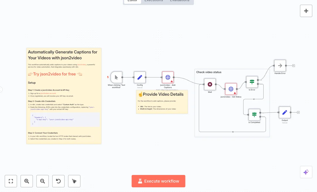 Add captions to hosted videos with a simple run. The workflow sends your video to json2video, waits while it processes, and returns a shareable link. Best for marketing teams and content creators who need fast, consistent captions.