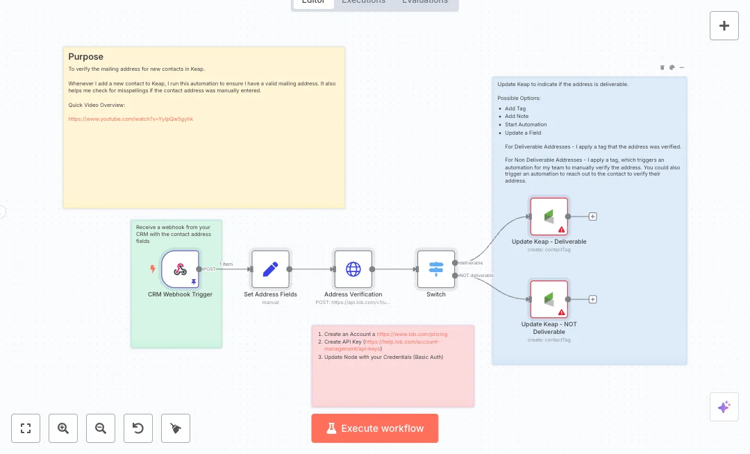 Set up is simple. You will need a mail verification account and an API key, plus a Keap connection in n8n. Map your CRM fields to the request, send a test record, and confirm the correct tag is applied. Expect fewer returns, faster mail prep, and clearer next steps for your team. Ideal for list cleaning, event invites, and subscription box shipping.