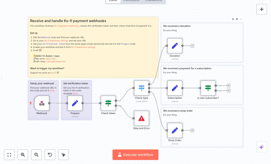 You need a Kofi account and access to webhook settings. Copy the webhook URL from the Webhook node into your Kofi dashboard and paste the verification token from Kofi into the Prepare step. Turn on the workflow and run test events from Kofi to confirm each path. Expect faster handoffs, fewer mistakes, and less manual sorting. Great for creators and small shops that want to send thank you notes, process orders, and start member access right away.