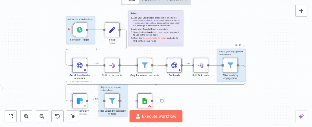You need a Leadfeeder API token, a Clearbit API key, and Google Sheets access. Expect faster prospecting, better data, and fewer manual steps. Great for account based marketing, B2B teams, and agencies that need a daily list of warm companies. Adjust the schedule, filters, and sheet mapping to match your goals.