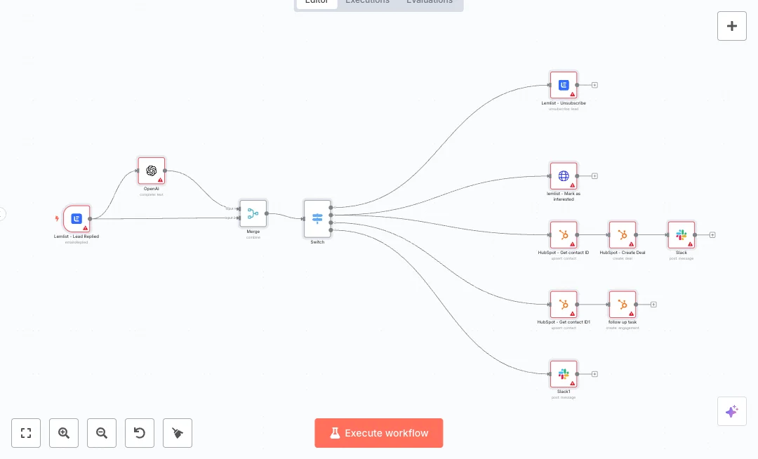 When a lead replies, an app event from Lemlist starts the flow. OpenAI reads the message and returns one label: Unsubscribe, Interested, or Out of Office. A Merge keeps the original data and the AI result together, then a Switch routes the path. Unsubscribe removes the lead from the Lemlist campaign. Interested marks the lead as interested, finds the HubSpot contact by email, creates a deal, and posts a Slack alert with the deal link. Out of Office finds the contact and creates a HubSpot task to follow up later. A fallback sends a Slack note so nothing is lost.