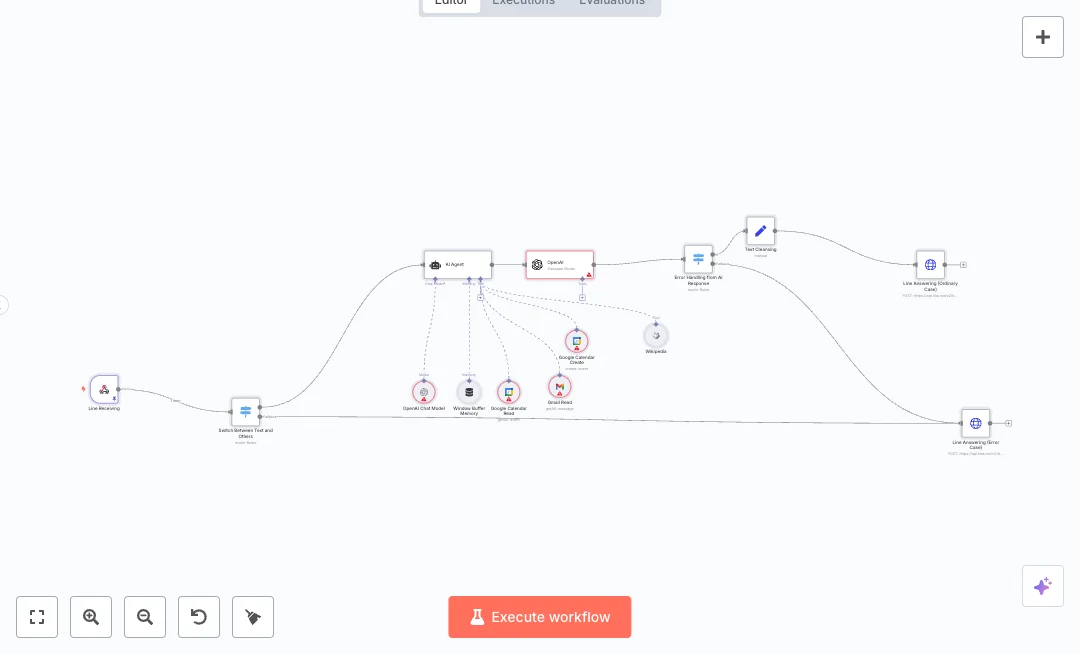 Messages come into n8n from a LINE webhook. A switch checks if the message is text. If not, a friendly reply asks for text. If yes, an AI Agent reads the message and keeps the chat context by user ID. The agent uses GPT 4o mini, can read Gmail, check or create Google Calendar events, and pull facts from Wikipedia. A second OpenAI step condenses the answer into a short and readable message. A text cleaning step removes extra line breaks, then a reply is sent back to LINE using the official API. If anything goes wrong, an error path sends a safe fallback reply.