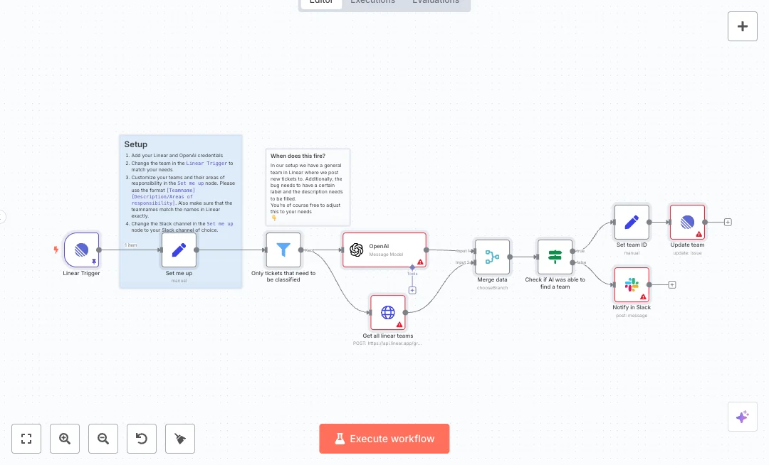 You need accounts for Linear, Slack, and OpenAI. Set the team in the trigger, define your team names and areas of responsibility in the setup node exactly as they appear in Linear, and set your Slack channel. Expect faster handoffs, fewer misroutes, and less time reading tickets, especially when bugs first arrive in a general inbox.