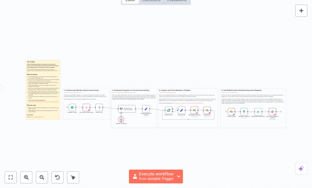 Every 30 minutes a schedule pulls recently updated issues from Linear using a GraphQL request. Each issue is split and its comment thread is turned into a single plain text block. An AI model reads the text and returns a simple sentiment and a short summary. Results are merged with issue details and saved to Airtable using an upsert, which also keeps the previous sentiment for comparison. An Airtable event then checks for a non negative to negative shift, removes repeat alerts, and posts a clear message to Slack with the issue link.
