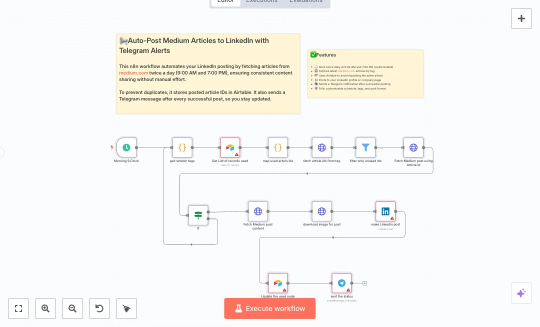 You will need a RapidAPI key for the Medium endpoint, a LinkedIn account connection, an Airtable base for storing used IDs, and a Telegram bot token. Most teams see a daily time saving of 30 to 60 minutes and a more consistent posting rhythm. It fits content curation for tech topics, developer advocacy, and brand pages that want reliable activity without constant hands on work.