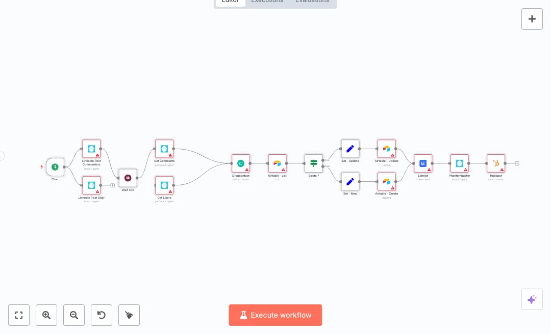 Turn LinkedIn post engagement into ready to reach leads. The flow collects people who like or comment on a post, enriches their data, saves them in Airtable, and sends them to your email outreach tool and CRM. It fits teams that want steady top of funnel leads without manual copy and paste.