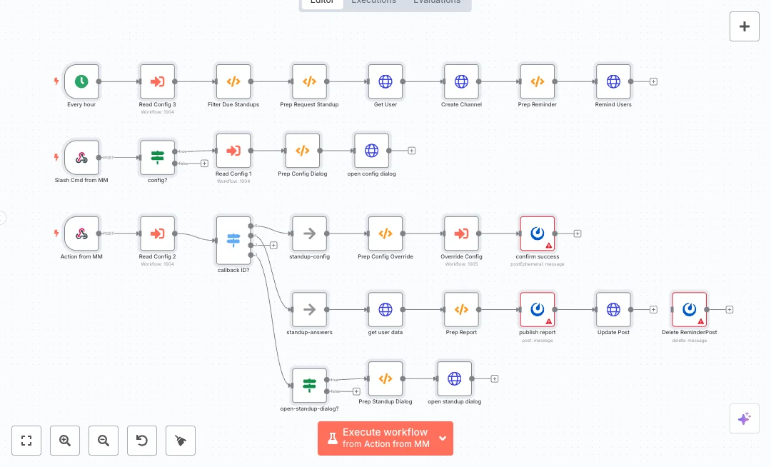 Two webhooks listen to slash commands and button actions. A config dialog opens in Mattermost, and settings are saved through a helper workflow. Every hour a schedule reads the config, finds which standups are due, and prepares requests. It can create a team channel, ping users, and open a standup form. When someone submits, the flow looks up their profile, builds a summary, posts it to the channel, and updates reminder posts. All actions use the Mattermost API with a bot token.