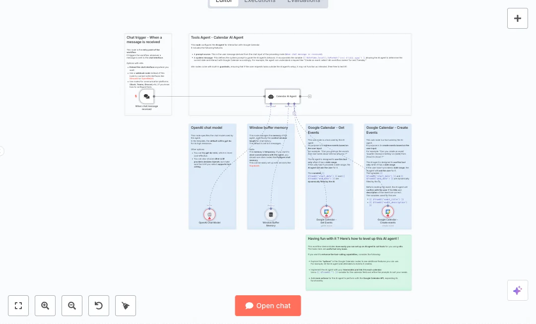 A chat trigger starts the flow when a message arrives. An AI agent powered by an OpenAI chat model understands your intent and keeps the last five messages as context. When you ask to list or create events, the agent calls two Google Calendar tools. It only runs a tool when it has a start and end date. If dates are missing, it asks follow up questions. Before creating an event, it confirms the title and description. Dates, times, and text are passed with AI variables to fill the calendar fields.