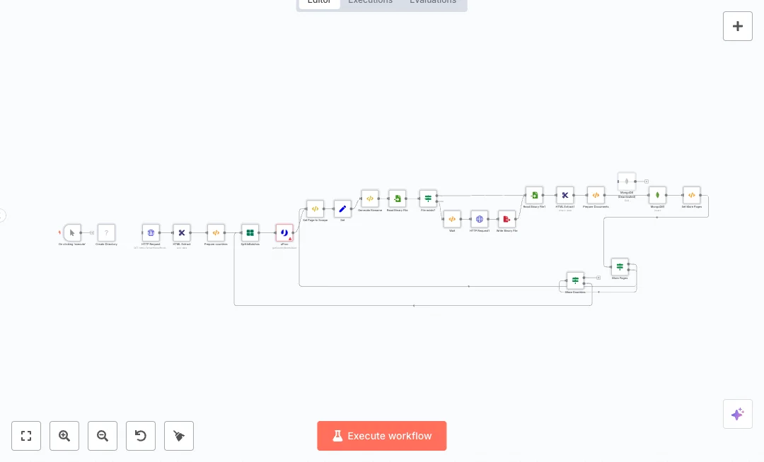 The run starts on manual execute. It pulls a list of country links, splits them into single country batches, and normalizes each country to an ISO code using uProc. For each page, it builds the URL, stores the HTML in a local cache, and waits one second to avoid rate limits. The parser reads names, city, branch, and swift code fields, follows next page links, and keeps inserting documents in MongoDB with timestamps. Caching cuts repeat downloads, and pagination ensures full coverage across all pages.