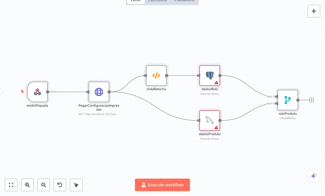 The flow begins with a webhook that receives the request. It then fetches print settings from a config service, collects roll details from PostgreSQL, and loads product grade data from MySQL. A function prepares the input, and a merge step ties both datasets together using the movement detail id. The response returns only after the merge completes, so your label app gets one consistent dataset.