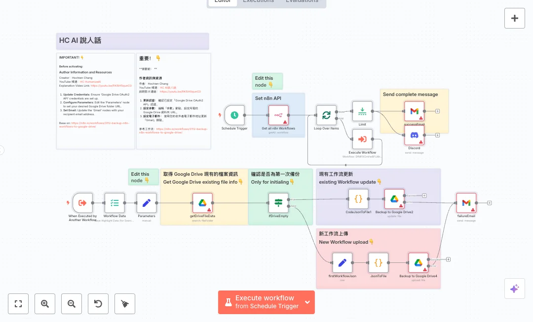 Here is how it runs. A scheduler starts daily and a second trigger lets other workflows call it when needed. The flow pulls all workflows from the platform API, then loops through them in batches. It checks a Google Drive folder first. If the folder is empty, it treats the run as the first backup and uploads files. If files already exist, it updates them by name and id. Two small code steps turn each workflow into a JSON file. File names follow a clear pattern using the workflow name and id. After processing, it sends a summary email and a Discord message. A limit node can cap how many items run in one go for safety.