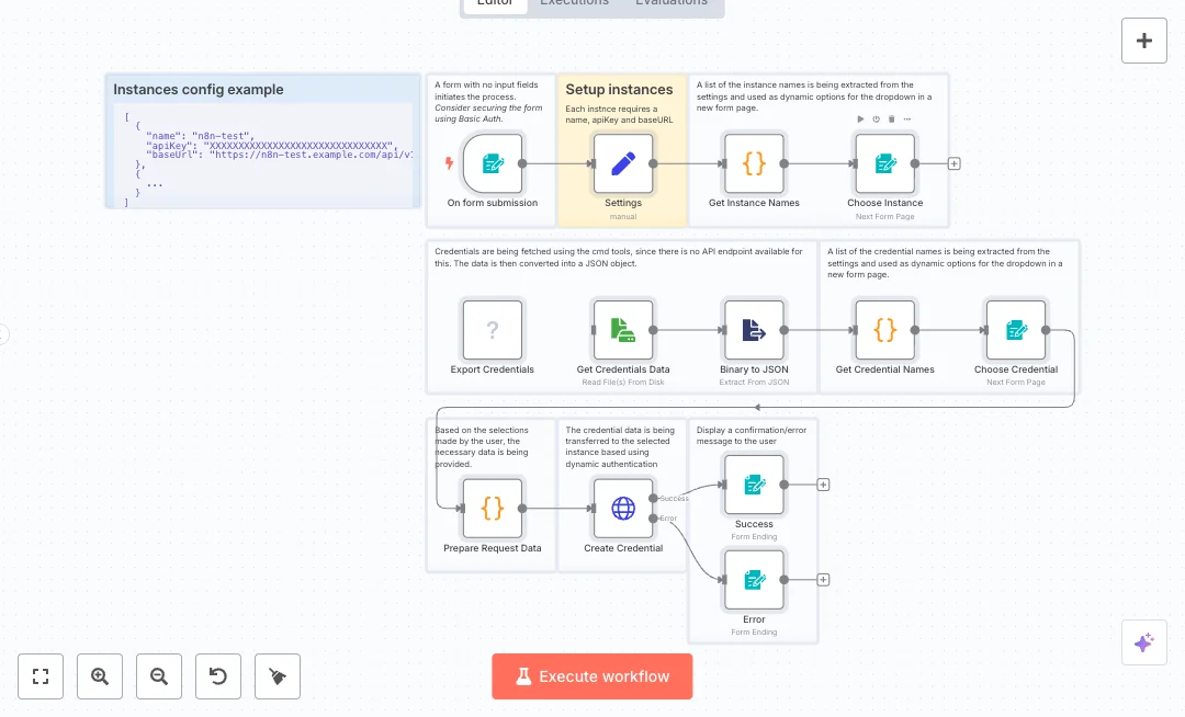 Move saved credentials between n8n instances with a simple guided form. Users pick the destination and the exact credential, and the system copies it securely. Great for admins who run test, staging, and production and want a fast and safe handoff.