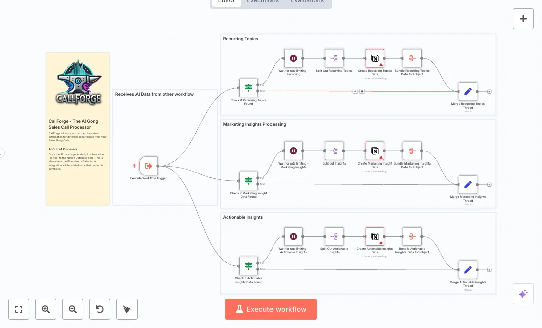 An Execute Workflow Trigger receives structured data from another flow. Three checks look for marketing insights, recurring topics, and actionable items. Each branch waits a few seconds to respect Notion limits, splits arrays into single items, and creates pages in the right Notion databases. Results are bundled and merged so later steps can use one clear output. Two separate Notion credentials can support different workspaces or databases.