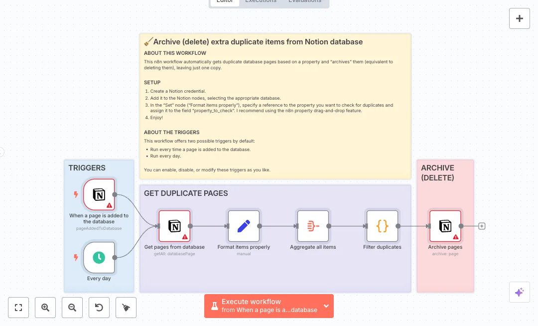 Setup is simple. Connect your Notion account and map the property_to_check field in the Set node to the Notion property you care about. Start in a test database and enable only one trigger at first. Expect faster search, fewer reporting errors, and less time spent on manual cleanup. Great for Notion based CRMs, content libraries, project boards, and asset catalogs where duplicates happen.