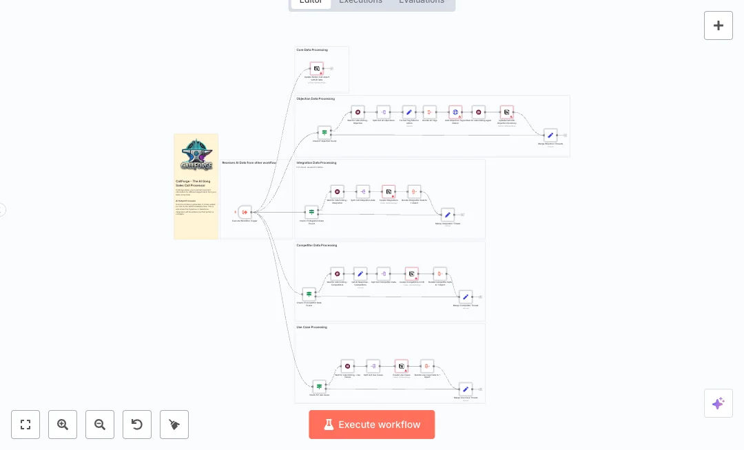 Triggered by another workflow, it receives structured AI output and a Notion page id for the call. If nodes check for each data type. When items exist, Split Out nodes break lists into single items, Set formats tags, and Aggregate nodes bundle data before writing. Notion nodes create pages in dedicated databases for competitors, integrations, and use cases, while the call page gets an objection summary. A direct HTTP request updates tags when needed. Wait nodes pause writes to handle Notion rate limits, and Merge nodes bring the threads back together.