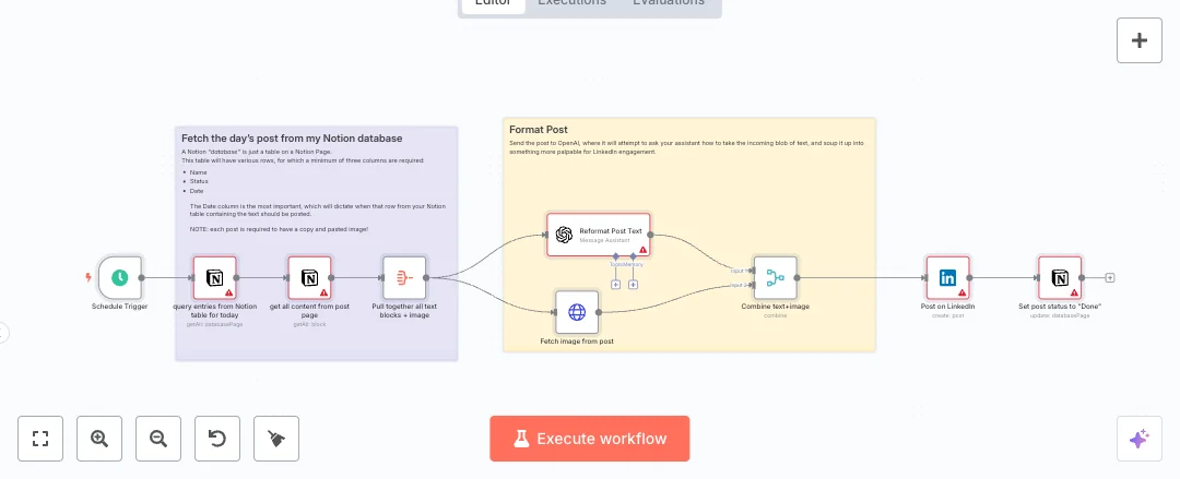 At a set time each day, a schedule checks a Notion database for items that match today. The flow reads the page blocks, gathers the text, and pulls the first image file. An AI assistant reformats the writing into clean paragraphs and lists for better engagement. The image and the new text are paired and published as an image post on LinkedIn. Once the post is live, the Notion row is marked Done.