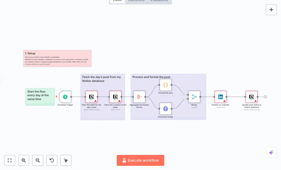 You need a Notion workspace and a LinkedIn account. Share the Notion database with the integration and pick the database ID in the node. Select your LinkedIn profile or company in the LinkedIn node. Expect to save about 30 minutes per day and keep daily tips, product updates, or hiring notes going out on time. This setup supports a simple daily content pipeline with clear, repeatable steps.