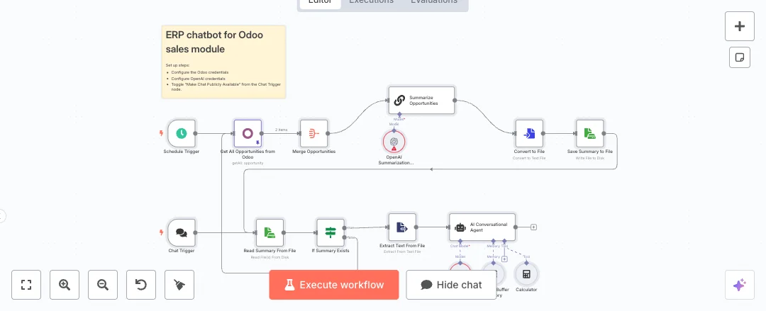 Turn your Odoo pipeline into a simple chat you can ask about deals. A scheduled job pulls opportunity data, creates a clear summary, and a chat bot answers questions about it. Great for sales teams that want quick status without logging into Odoo.