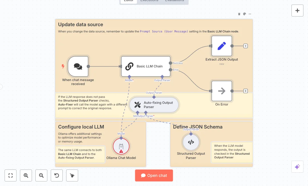 A chat event starts the flow when a message arrives. The message goes into a basic LLM chain that asks the model to fill a JSON schema and uses the current date for context. The same Ollama model powers both the chain and an auto fixer. A structured output parser checks the JSON against a manual schema. If the check fails, the auto fixer asks the model to correct the format and try again. A final step pulls the output JSON so it is ready for the next system. An error path keeps failures from breaking the run and makes testing easier.