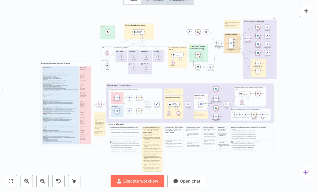 A chat message starts the flow and feeds an AI model with a system prompt and schema stored in Google Docs. The AI writes captions, hashtags, and an image prompt, then saves the post JSON and image to Google Drive. An approval email goes out through Gmail. If approved, a router publishes to the selected channels using Twitter, Facebook Graph for Instagram and Facebook, and LinkedIn. Telegram can send success or error updates. The workflow also supports a memory buffer, optional web image hosting, and collects publish responses.