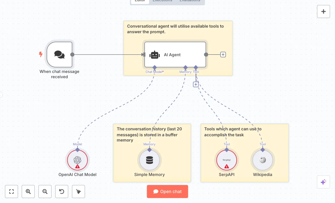 Setup is simple. Connect OpenAI and SerpAPI, pick the model, and confirm the memory window is set to 20. Expect faster first replies, fewer handoffs, and more chats handled per agent. Great for website chat, in app help, or internal support desks that need quick and accurate answers with trusted sources.