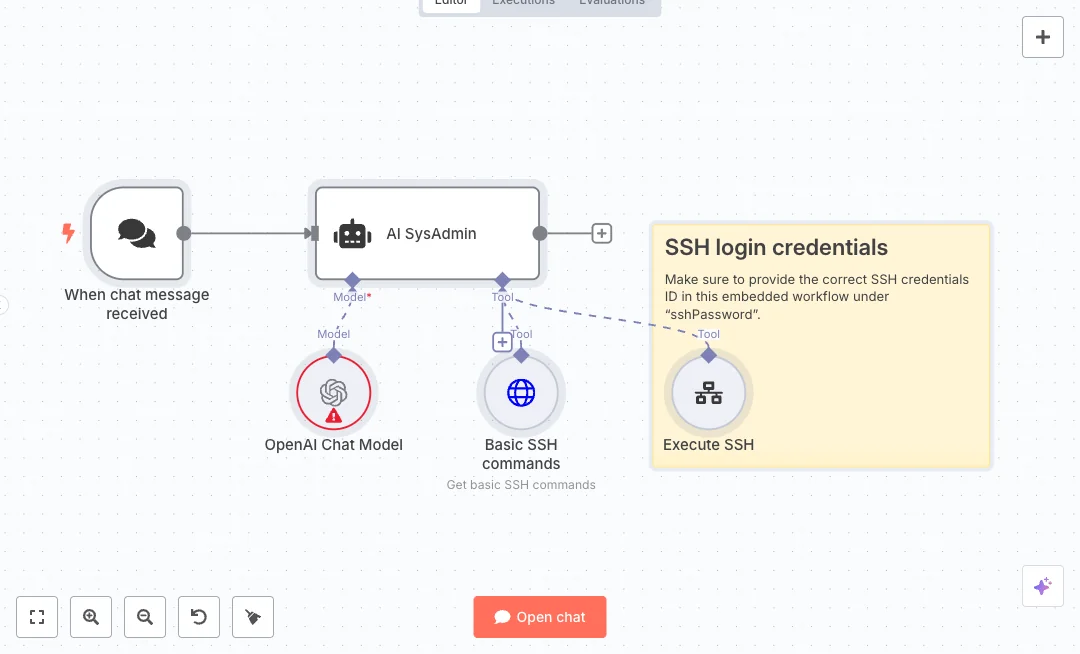 Messages enter through a chat trigger. The AI agent uses an OpenAI chat model to plan and explain steps. It can fetch a simple SSH commands guide for reference, then send only the command text to an embedded SSH tool. That tool connects to your server with saved SSH credentials and runs the command. Ask for disk usage, restart a service, view logs, or check uptime. Results return in the chat so you work from one place.