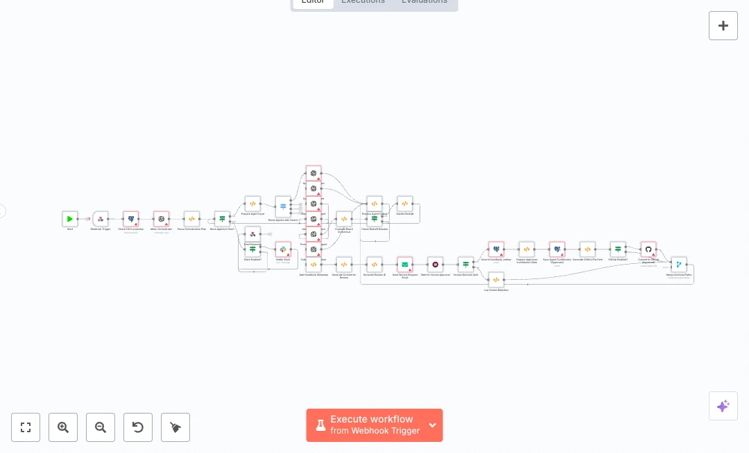 Here is how it works. A webhook on POST pyragogy/process receives the request, then a quick database query confirms the PostgreSQL connection. A Meta Orchestrator using OpenAI plans the best agent order in JSON. The flow loops through agents with a switch, including Summarizer, Synthesizer, Peer Reviewer, Sensemaking, Prompt Engineer, and Onboarding. A board style check decides if a redraft is needed. The system builds a review package and ID, emails a reviewer, and waits for the decision. If approved, it writes to PostgreSQL and can also commit to GitHub. Slack notices can be sent to keep the team updated, and the caller gets a final webhook response.
