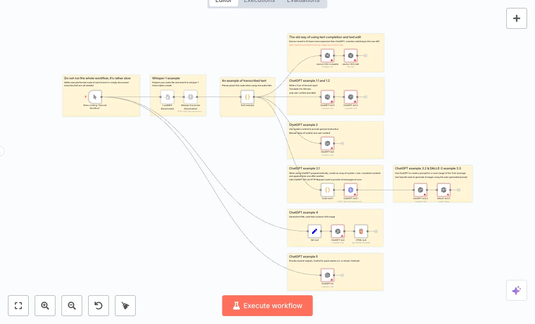 It starts with a manual click. An audio file is read and sent to speech to text. Sample text also flows into several paths. One path creates a short tl dr summary. Another path translates the text into German. A code step builds a full message list and calls the chat API by HTTP for more control. The next step asks the model to write a prompt for an image. Then four images are created. A separate branch uses a set node and a chat step to output clean HTML with an SVG. There is also a quick reply generator for fast responses.