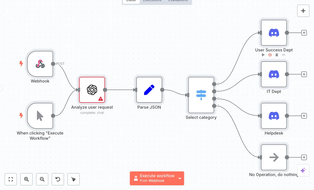 Here is how it works. A webhook receives a POST request or you can trigger it manually for testing. The message goes to OpenAI GPT 4, which returns clean JSON with a category and an instruction. A JSON parser prepares the reply, and a Switch checks the category. Messages labeled success story go to the User Success channel, urgent issue goes to IT, and ticket goes to Helpdesk. If no match is found, the flow stops safely with a NoOp step.