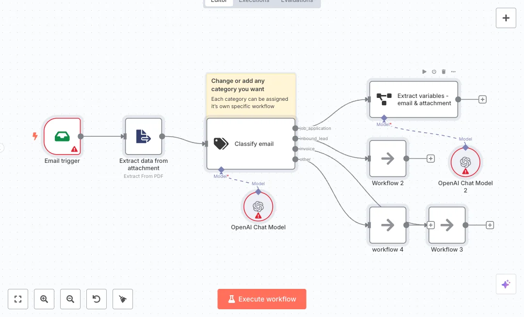 The flow starts by watching an email inbox over IMAP. It downloads the first attachment and extracts text from the PDF. An OpenAI model then reads the email and the attachment together. It assigns a category such as job application or inbound lead, and extracts fields like first name, last name, age, email, and other resume data. Based on the chosen category, the message can branch to different paths, which you can connect to your own hiring or sales tools.