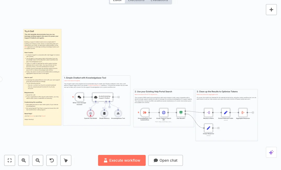 Setup is simple. Add your OpenAI key and point the HTTP node to your help portal search endpoint, such as an Algolia index behind your knowledge base. Expect faster answers, fewer escalations, and less content maintenance because you reuse what you already have. Great for SaaS support, internal IT help desks, and teams that want to scale chat without copying data.