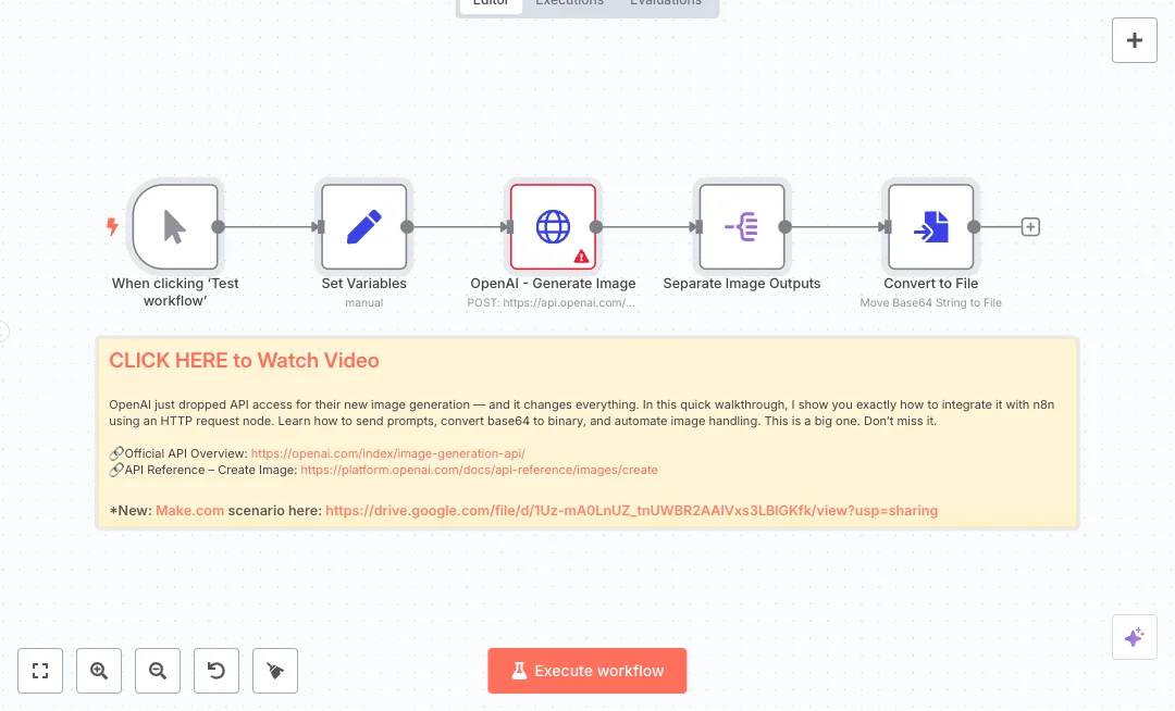 It starts with a manual test button. A Set step holds your prompt, model, image count, size, and quality. An HTTP request sends these details to OpenAI and gets a list of base64 image strings. A Split step turns that list into separate items, and a Convert step changes each base64 string into a binary image file. You finish with clean files that can flow into storage, a CMS, or a review step.