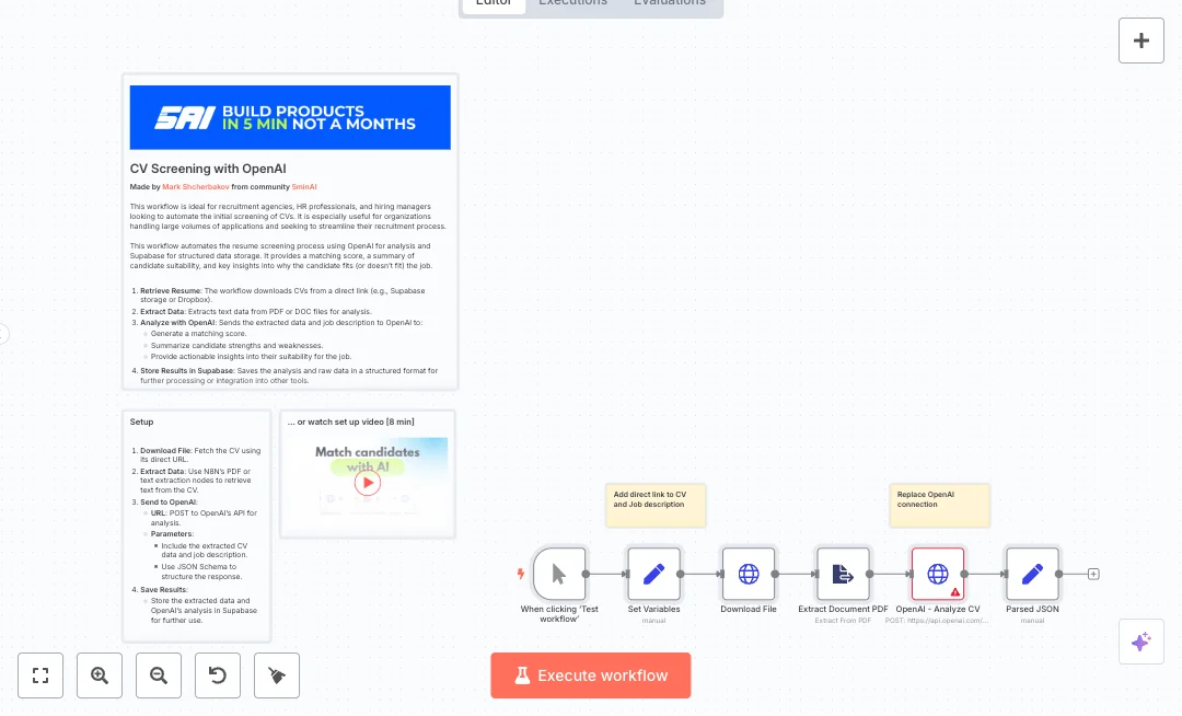 You need an OpenAI API key and a public direct link to each CV file. Expect review time to drop from thirty minutes to a few minutes with more consistent scoring. This suits staffing firms, in house recruiters, and hiring managers who process many applicants and want a standard first pass across roles.