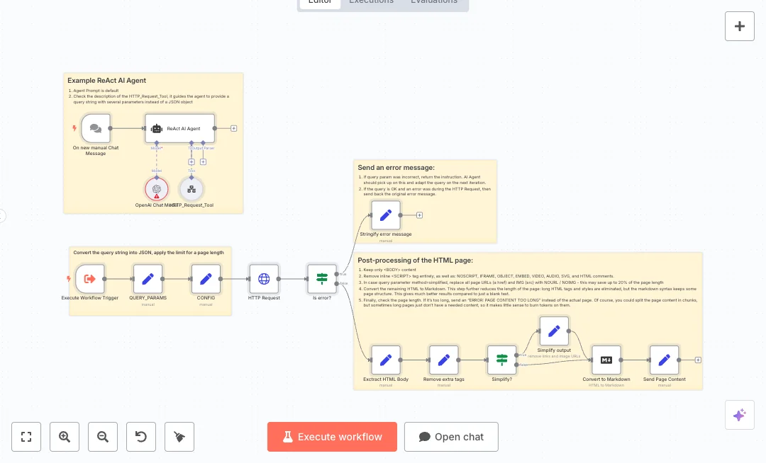 It starts from a manual chat message or as a called subworkflow. The agent uses OpenAI to decide when to call a web fetch tool with a query like ?url=site&method=full or simplified. The flow downloads the page, keeps only the body, removes scripts, ads, media frames, and comments, then turns the rest into Markdown. A size limit protects token use, and errors come back with clear tips so the agent can try again.