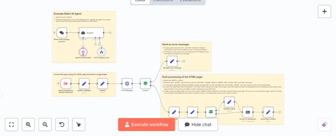Here is how it runs. A chat event starts the flow and an AI Agent with an OpenAI model decides how to call a web fetch tool. The tool expects a query string with url and method set to full or simplified. The query is parsed and a page length limit is applied. The page is requested and errors are checked. The body is extracted, heavy tags and scripts are removed, and links or image sources can be replaced with NOURL and NOIMG when simplified. The cleaned HTML is converted to Markdown and returned. A second trigger lets other workflows call the same fetch steps for reuse.