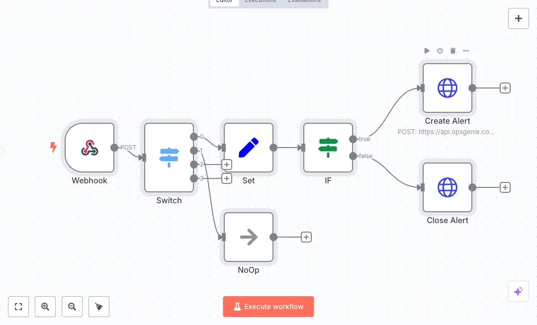 A webhook receives a POST payload from your source system. A Switch step checks the trigger value and only continues for agent offline events. A Set step maps key fields like alert id, computer name, and description. An IF check looks at the resolved flag. If the issue is not resolved, an HTTP request creates a new alert in Opsgenie with useful context. If it is resolved, another HTTP request closes the matching alert using the alias id. Non matching events are parked by a NoOp step to avoid clutter.