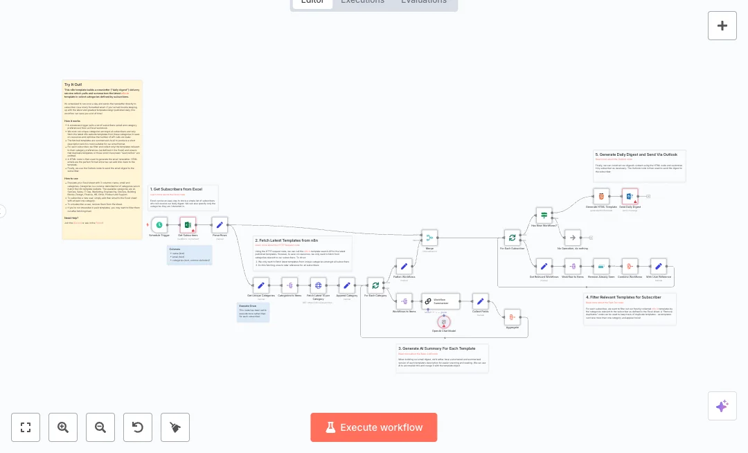A scheduled run reads your subscriber list from Microsoft Excel, extracts unique categories to cut API calls, and fetches the latest items per category with an HTTP request. Each item gets a short AI summary using OpenAI for easy reading. The flow then filters content per subscriber, removes duplicates seen in past sends, and skips email if there is nothing new. It builds a tidy HTML email and sends it through Microsoft Outlook.
