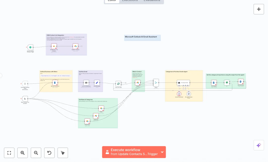 On a schedule, it pulls only uncategorized and unflagged emails from chosen Outlook folders. The body is cleaned into Markdown for clear AI reading. Contacts are refreshed from Monday.com and stored in Airtable along with your categories and rules. An AI agent reviews each message with that context and returns a structured result with the email id, category, and importance. The flow then updates the email in Outlook and skips changes when rules say to ignore.
